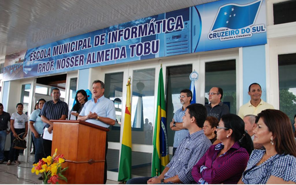 Autoridades e professores que trabalharam com Nosser Almeida discursaram na inauguração da escola municipal de informática de Cruzeiro do Sul. Eles destacaram o empenho de Vagner Sales, que em quatro anos de administração teria construído 45 novas escolas.