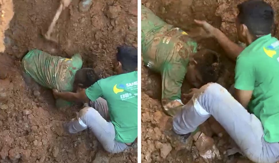 Um vídeo feito por pessoas que estavam no local mostra o momento em que o homem, em estado de desespero, pede socorro e se queixa de dores na coluna, enquanto colegas de trabalho removem o barro para libertá-lo.