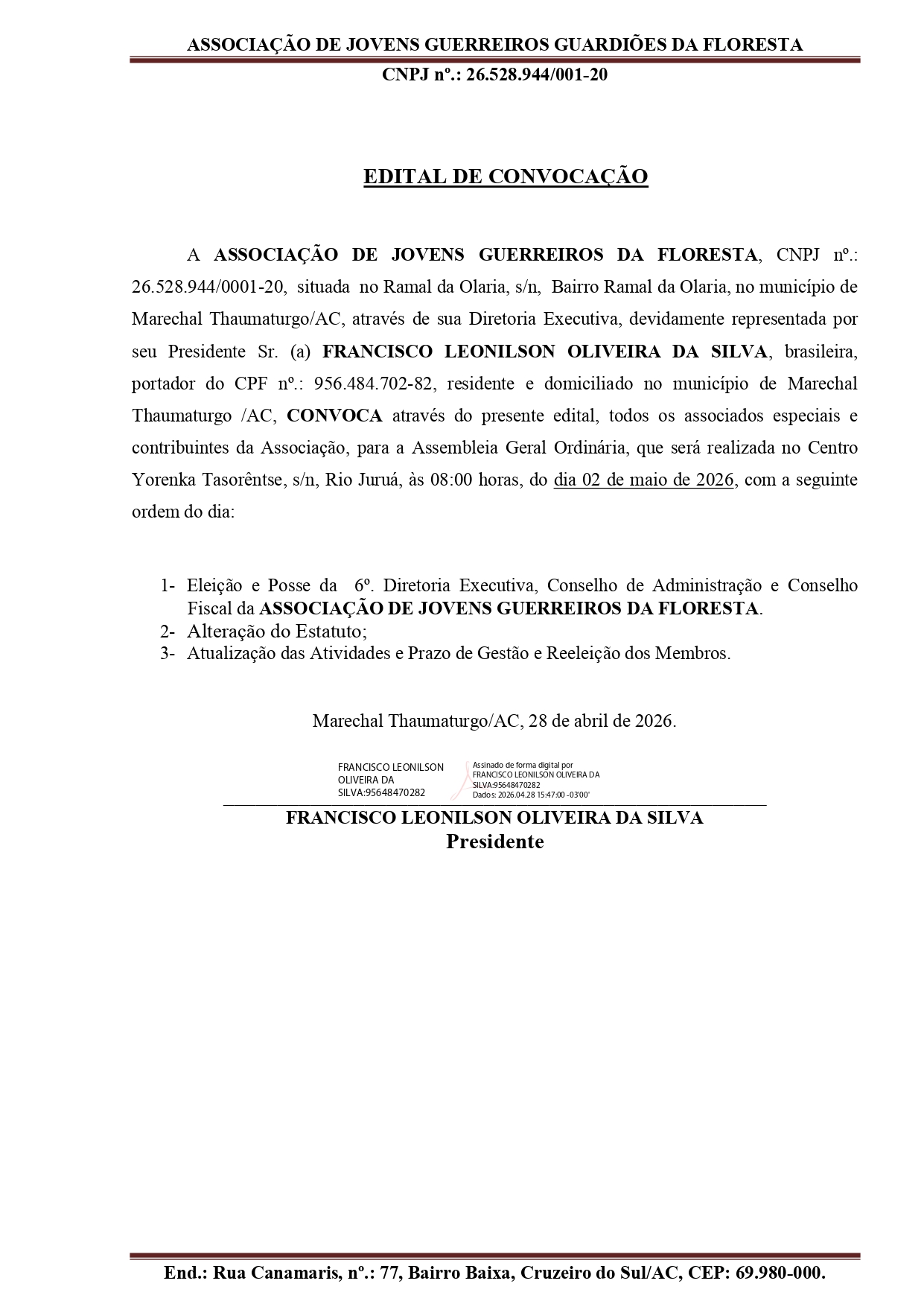 • Edital de Convocação – ASSOCIAÇÃO DE JOVENS GUERREIROS GUARDIÕES DA FLORESTA